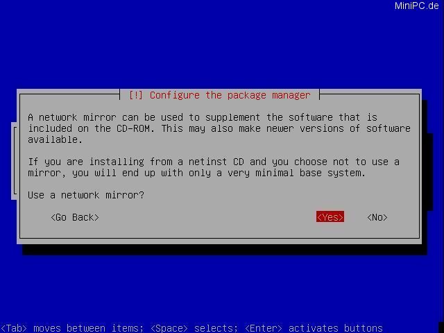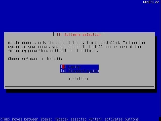 Choose a network data storage server. From this server your system later can install additional programs. Confirm with "Yes" and choose a server. Optional you can enter proxy-servers (If you do not know what to enter, then enter nothing). In the next screen choose "Standard System".