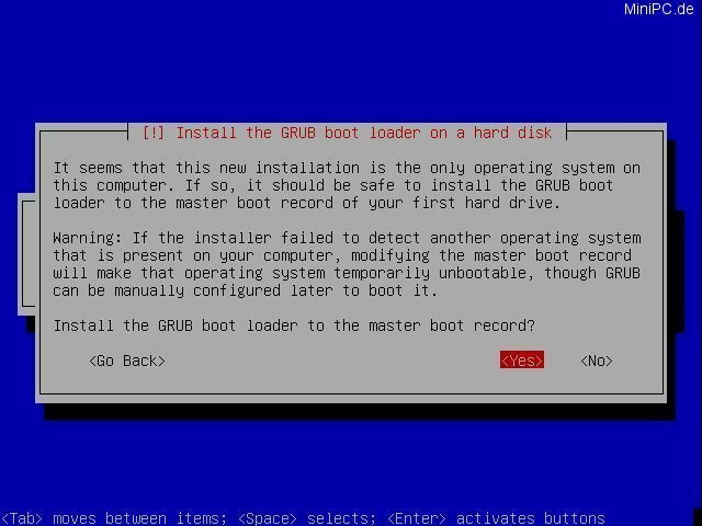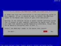 At the last screen Debian will ask if "Grub" shall be used as Boot-Loader. After your confirmation with "Yes" the last step of the interactive part of the installation is finished.