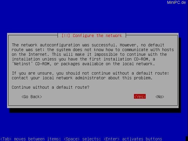 These screen messages (questions for Defaultroute and Nameserver) will only popup if you do not have a DHCP-server. Set the corresponding values for enabling Internet-access. Later during installation time we need access to the Internet for beeing able to install additional components.