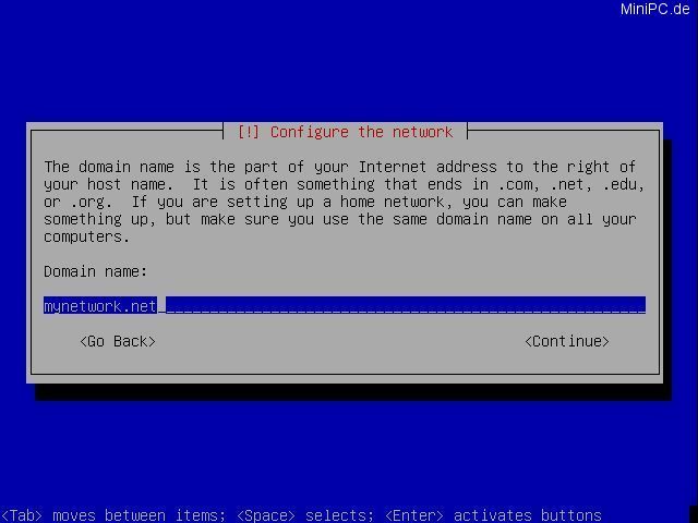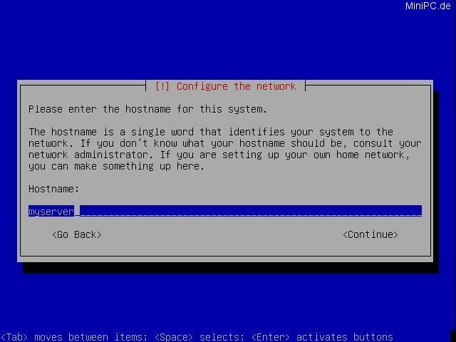 Enter an hostname for the system (eg. "myserver") and a network name (eg. "mynetwork.net").