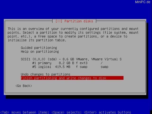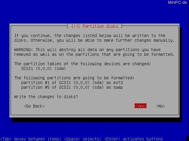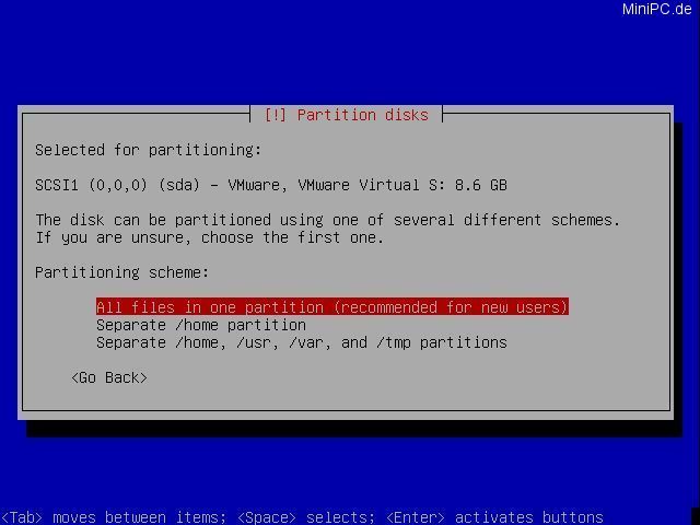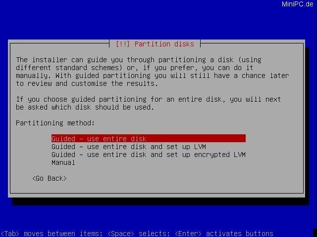 Now the system will partitionate the harddrive. Choose "Guided - use entire disk", and confirm the HDD in the next screen. Now choose "All files in one partition", and in the next screen confirm with "Yes".